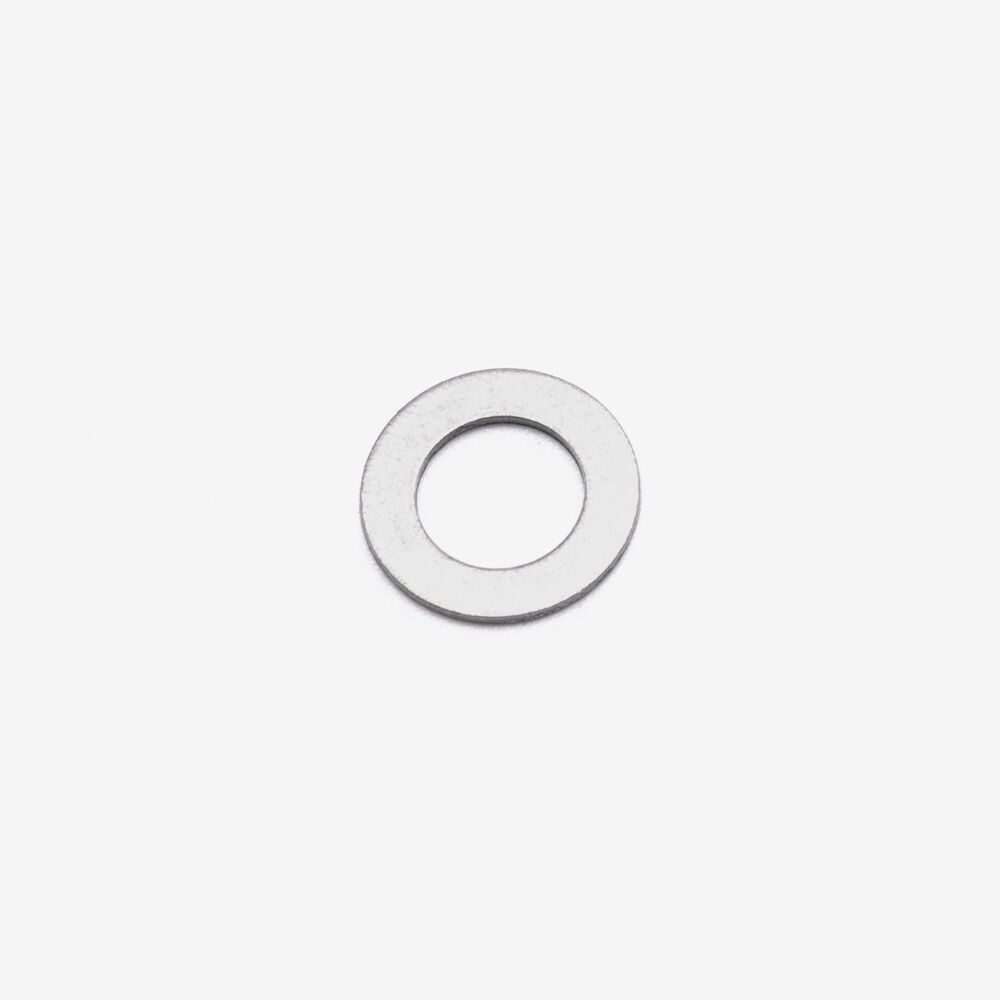 A washer is a flat, typically circular metal or plastic component used in motorcycle assemblies. It is placed between a fastener (like a bolt or nut) and the surface it is fastening to.