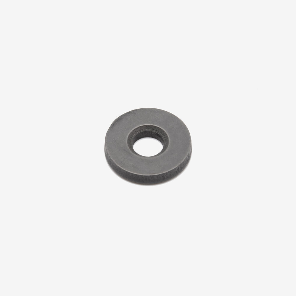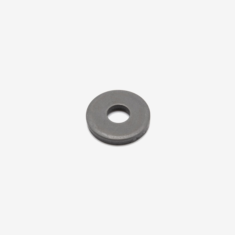 A washer is a flat, typically circular metal or plastic component used in motorcycle assemblies. It is placed between a fastener (like a bolt or nut) and the surface it is fastening to.