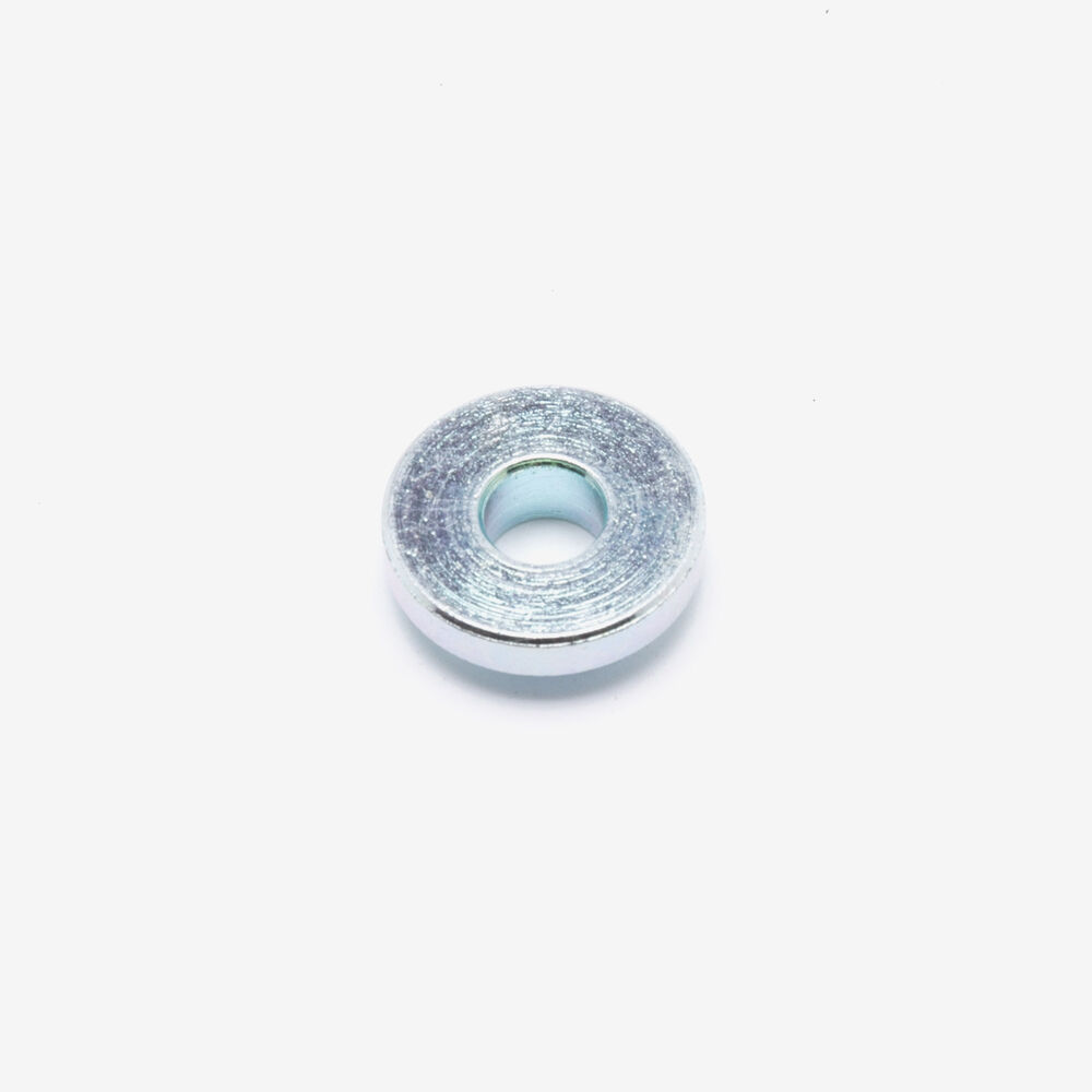 A washer is a flat, typically circular metal or plastic component used in motorcycle assemblies. It is placed between a fastener (like a bolt or nut) and the surface it is fastening to.