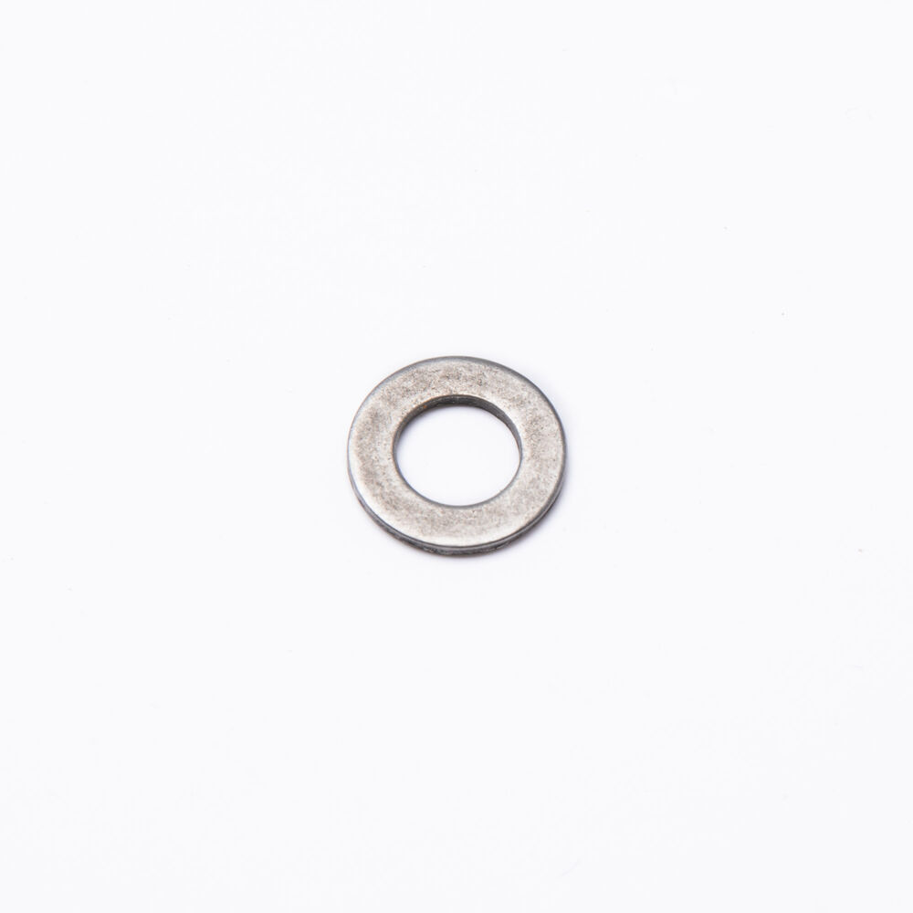 A washer is a flat, typically circular metal or plastic component used in motorcycle assemblies. It is placed between a fastener (like a bolt or nut) and the surface it is fastening to.
