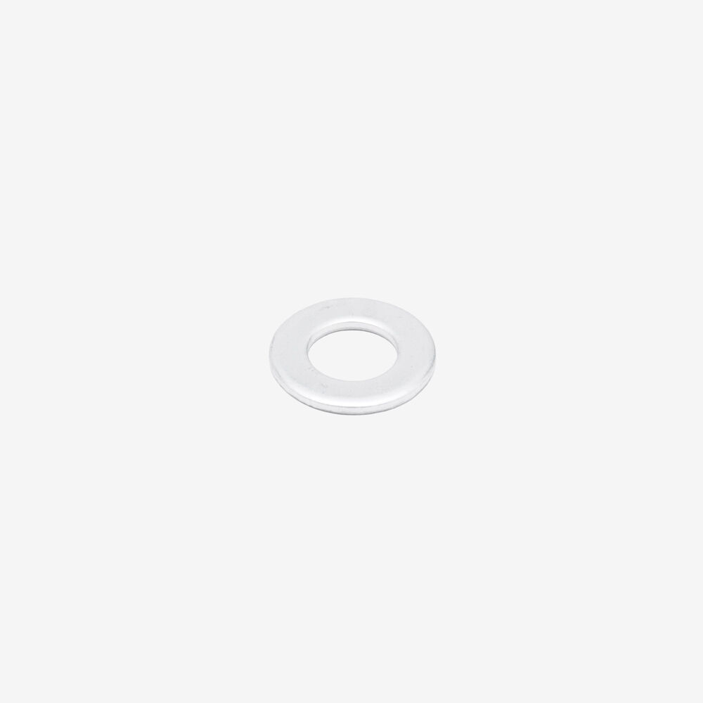 A washer is a flat, typically circular metal or plastic component used in motorcycle assemblies. It is placed between a fastener (like a bolt or nut) and the surface it is fastening to.