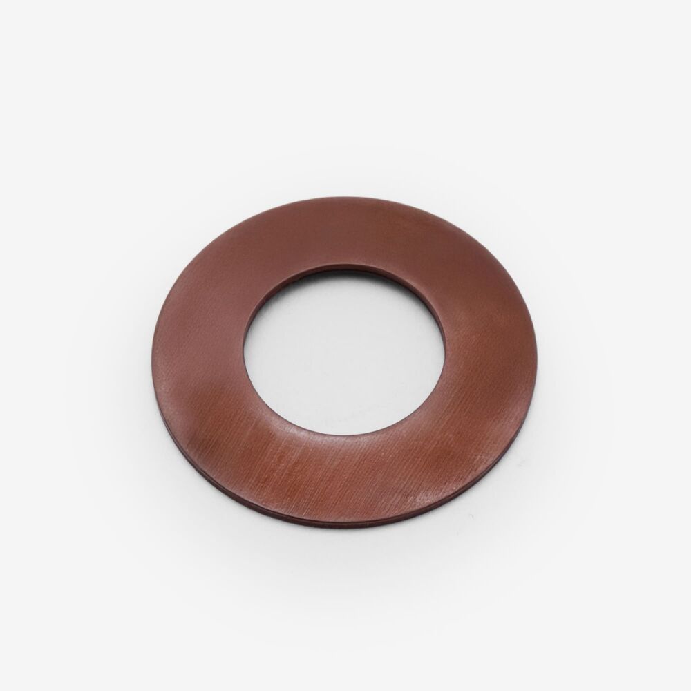 A washer is a flat, typically circular metal or plastic component used in motorcycle assemblies. It is placed between a fastener (like a bolt or nut) and the surface it is fastening to.