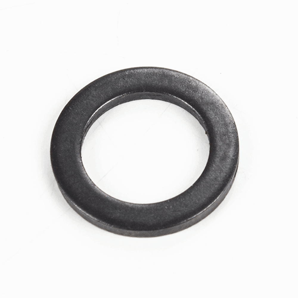 A washer is a flat, typically circular metal or plastic component used in motorcycle assemblies. It is placed between a fastener (like a bolt or nut) and the surface it is fastening to.