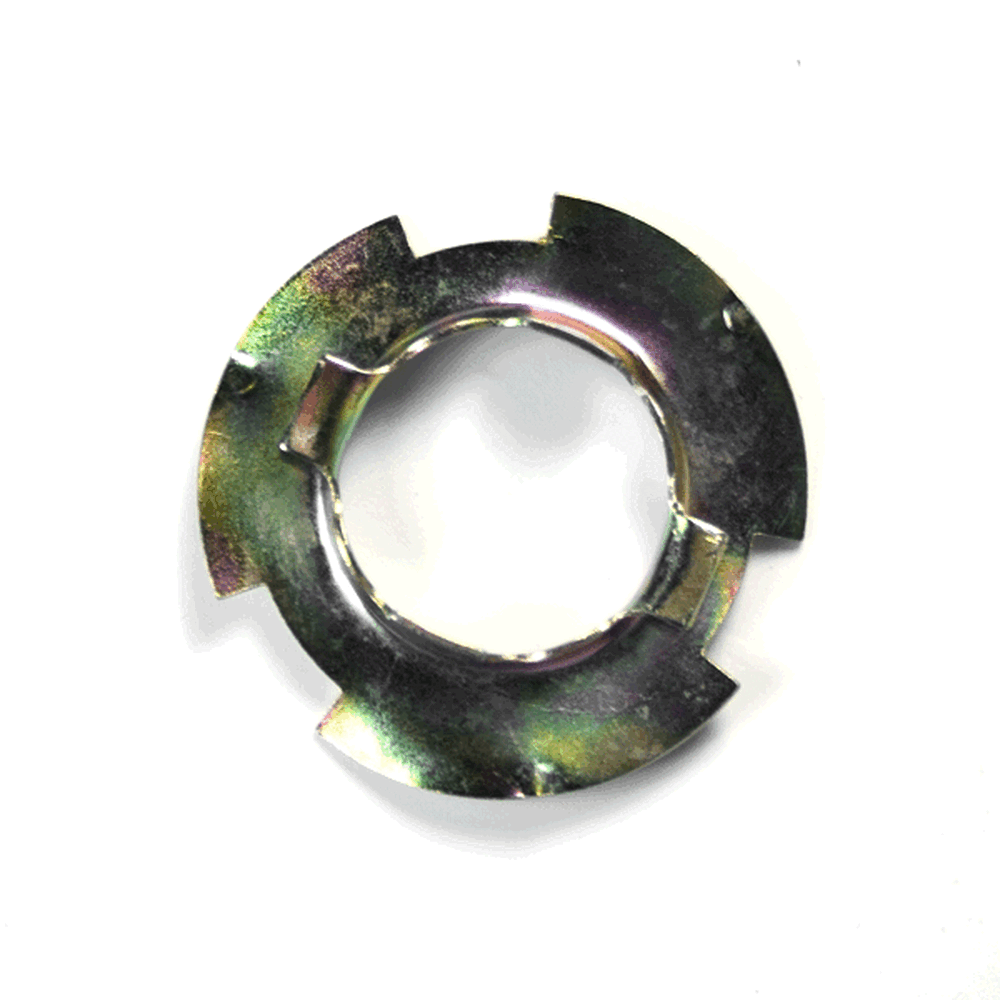 A lock washer is a type of washer used in a motorcycle's assembly to prevent nuts and bolts from loosening due to vibration and torque. It features a design, such as split ends or teeth, that creates extra friction and resistance, securing fasteners in place. Lock washers are essential for maintaining the integrity and safety of various components by ensuring connections remain tight and secure.