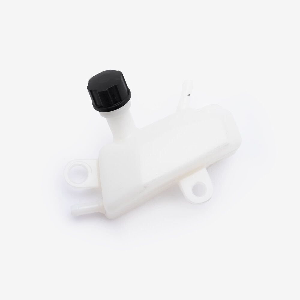 The coolant reservoir, also known as the expansion tank or overflow tank, is a container that holds excess coolant from the motorcycle's cooling system. It is designed to accommodate the expansion of coolant as it heats up and to ensure there is always an adequate supply of coolant available for the engine. Positioned near the radiator or cooling system, the reservoir helps to maintain proper coolant levels and prevents overheating by allowing coolant to return to the system as it cools down.