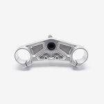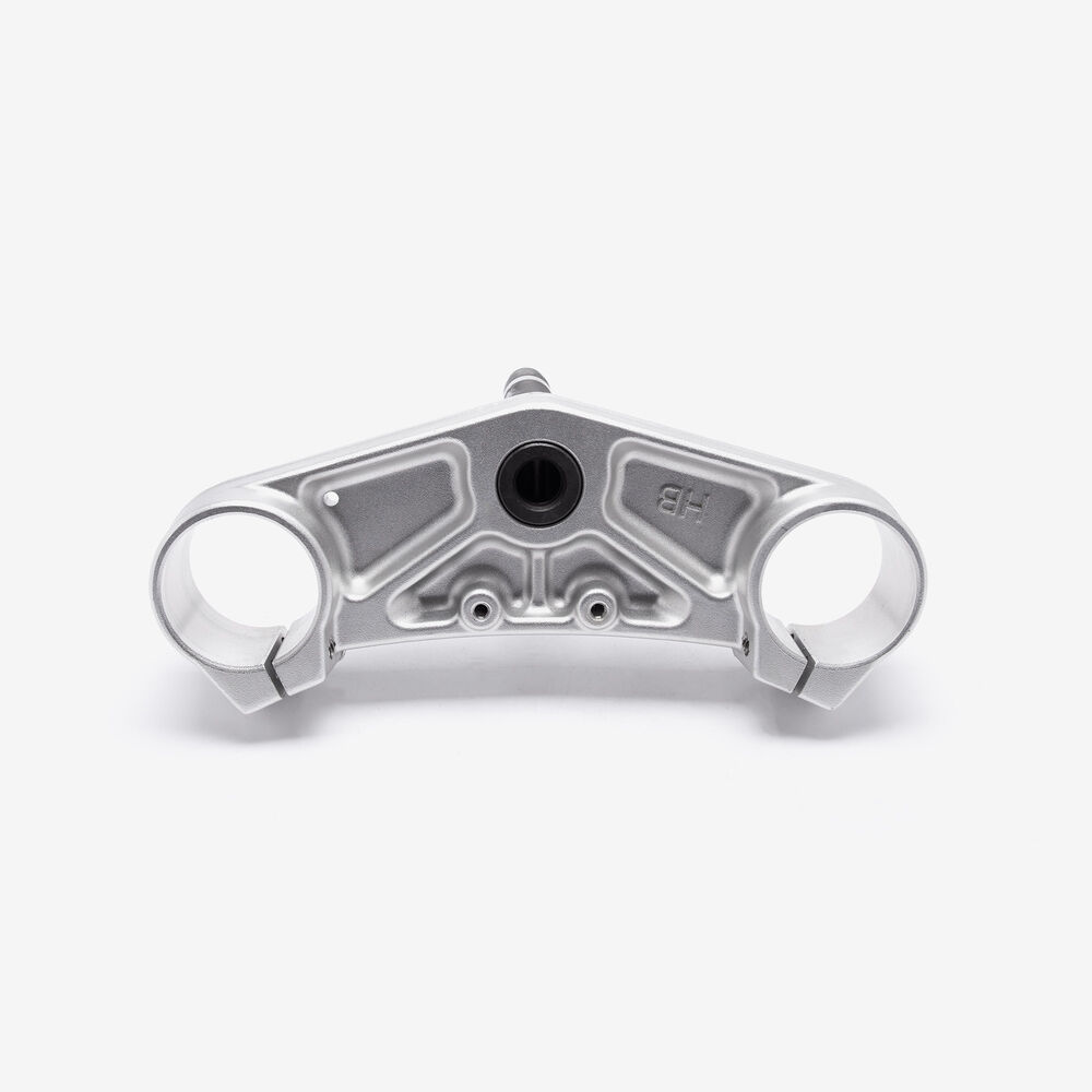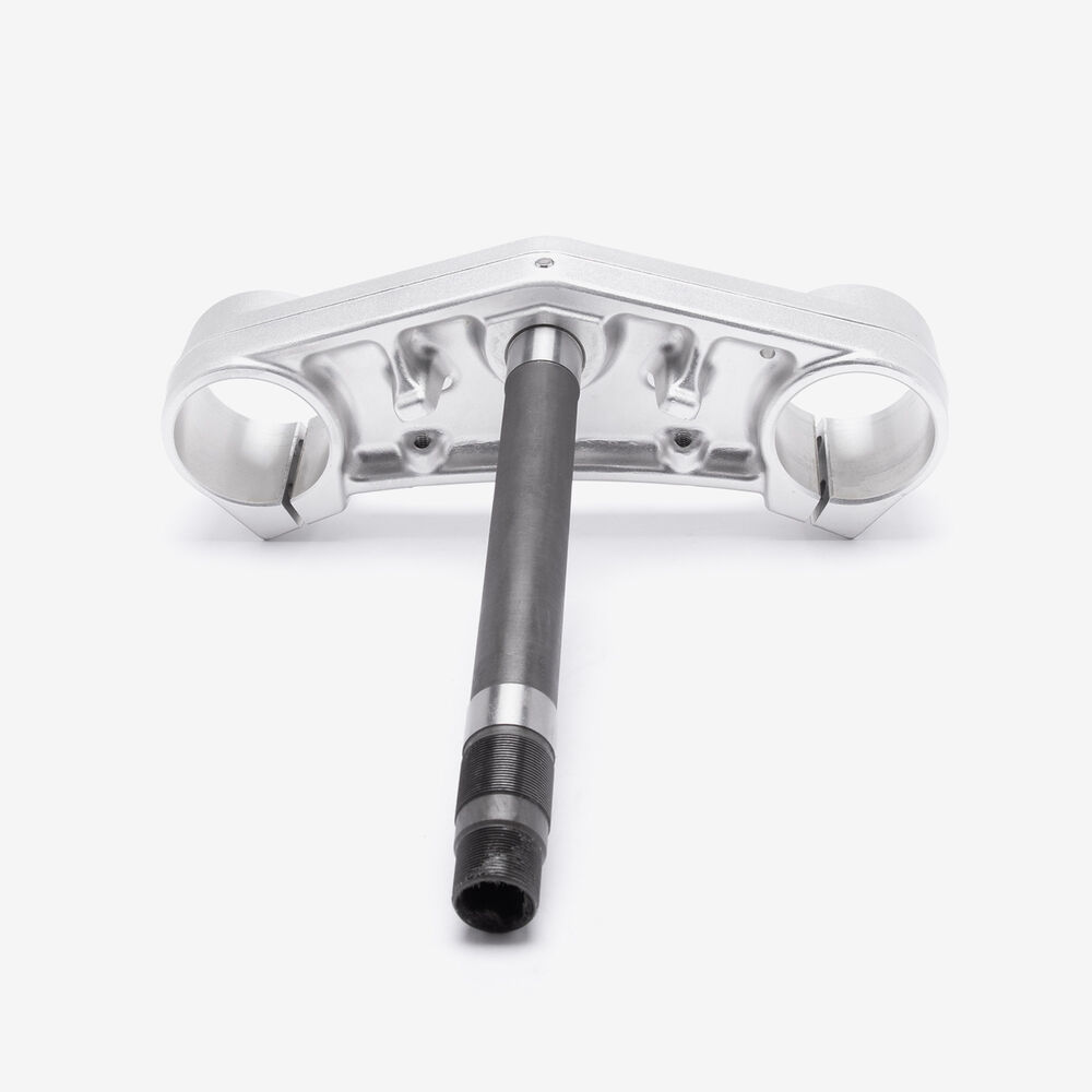 The bottom yoke, also known as the lower triple clamp, is a crucial component in a motorcycle's front suspension system. It connects the two fork tubes and secures them to the steering stem, providing stability and alignment for proper steering and handling. Typically made from durable materials like aluminum or steel, the bottom yoke ensures rigidity and strength while supporting the front end of the motorcycle.