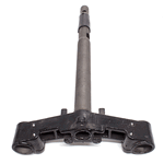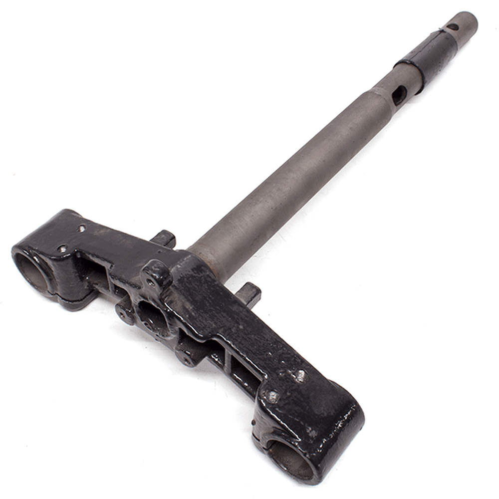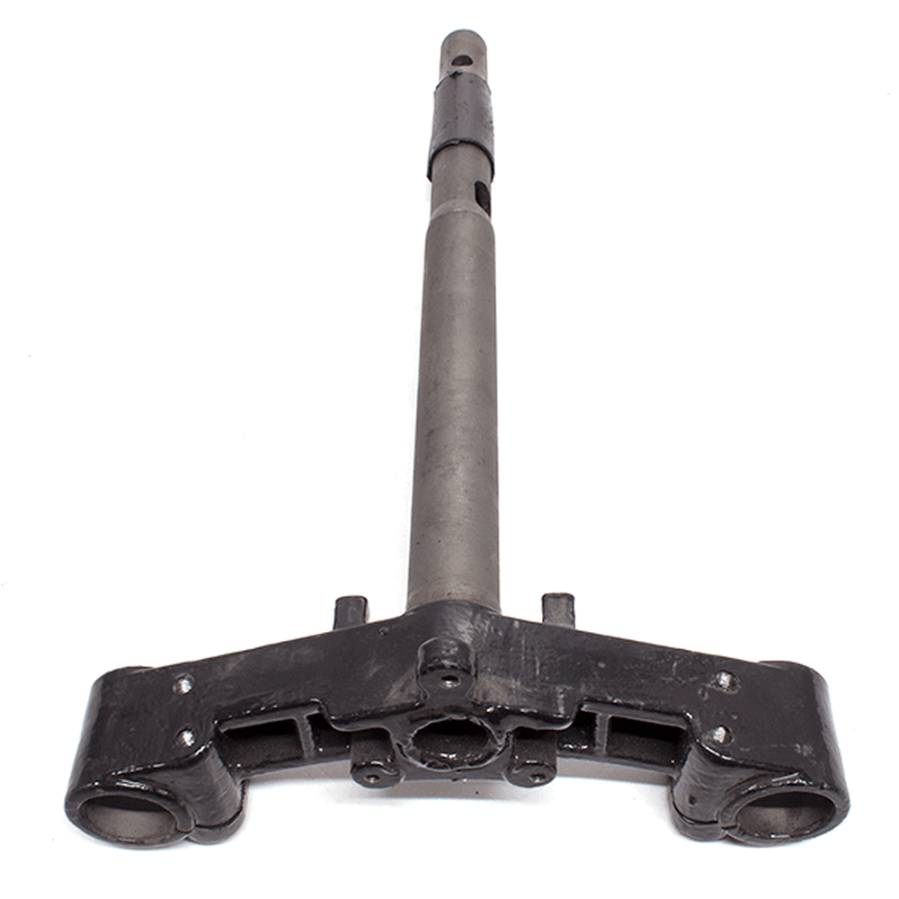 The bottom yoke, also known as the lower triple clamp, is a crucial component in a motorcycle's front suspension system. It connects the two fork tubes and secures them to the steering stem, providing stability and alignment for proper steering and handling. Typically made from durable materials like aluminum or steel, the bottom yoke ensures rigidity and strength while supporting the front end of the motorcycle.