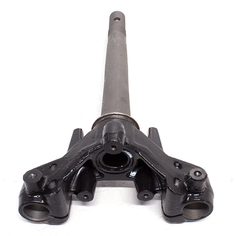 The bottom yoke, also known as the lower triple clamp, is a crucial component in a motorcycle's front suspension system. It connects the two fork tubes and secures them to the steering stem, providing stability and alignment for proper steering and handling. Typically made from durable materials like aluminum or steel, the bottom yoke ensures rigidity and strength while supporting the front end of the motorcycle.