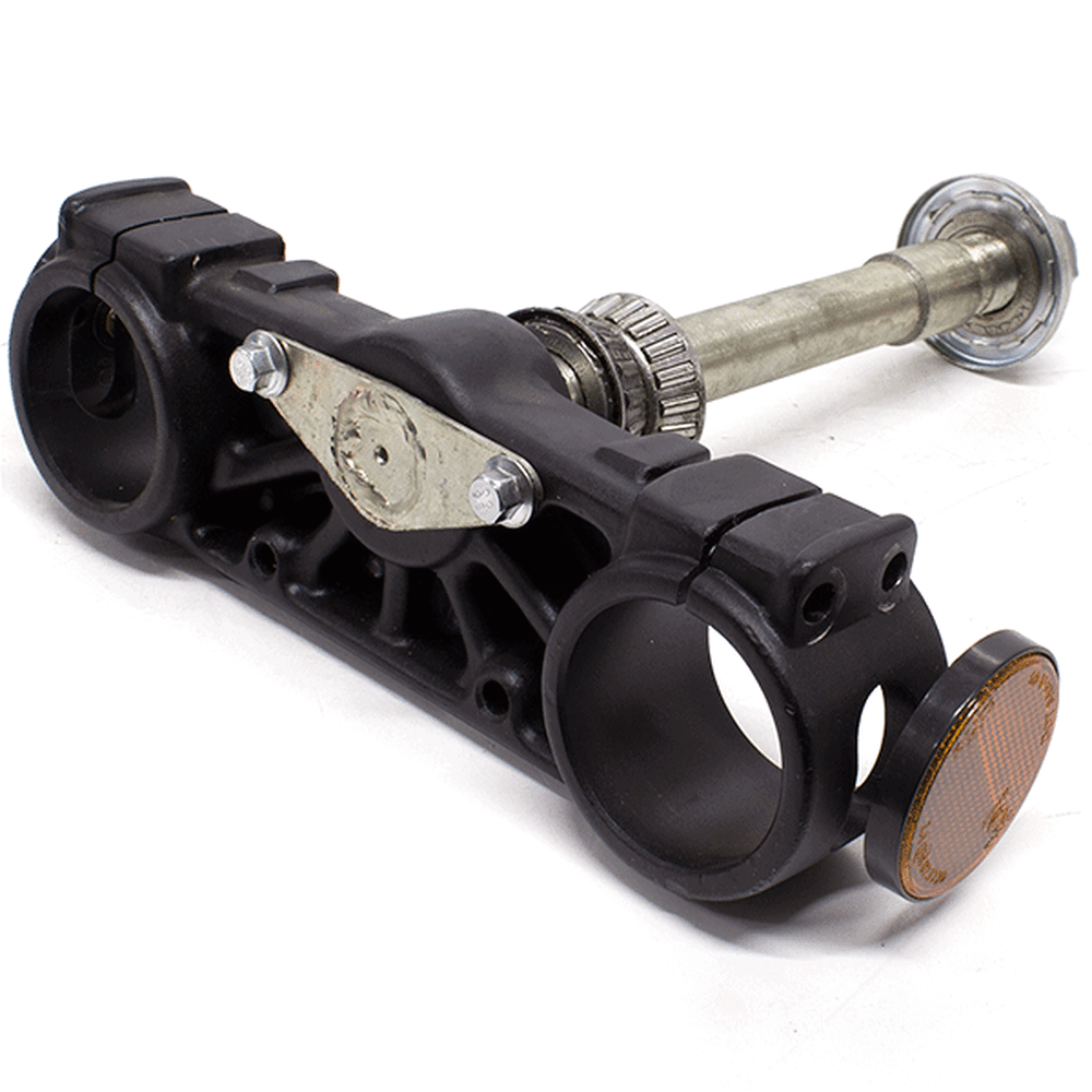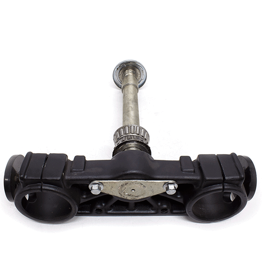 The bottom yoke, also known as the lower triple clamp, is a crucial component in a motorcycle's front suspension system. It connects the two fork tubes and secures them to the steering stem, providing stability and alignment for proper steering and handling. Typically made from durable materials like aluminum or steel, the bottom yoke ensures rigidity and strength while supporting the front end of the motorcycle.