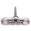 The bottom yoke, also known as the lower triple clamp, is a crucial component in a motorcycle's front suspension system. It connects the two fork tubes and secures them to the steering stem, providing stability and alignment for proper steering and handling. Typically made from durable materials like aluminum or steel, the bottom yoke ensures rigidity and strength while supporting the front end of the motorcycle.