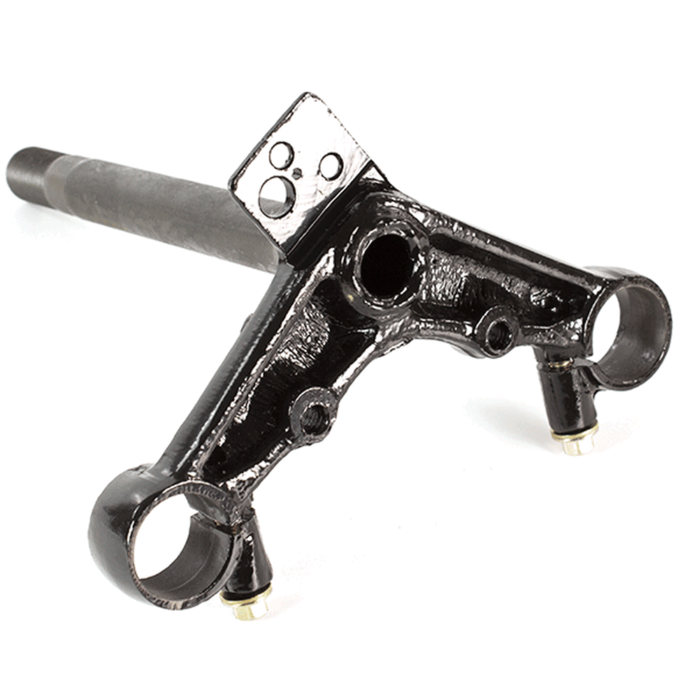 The bottom yoke, also known as the lower triple clamp, is a crucial component in a motorcycle's front suspension system. It connects the two fork tubes and secures them to the steering stem, providing stability and alignment for proper steering and handling. Typically made from durable materials like aluminum or steel, the bottom yoke ensures rigidity and strength while supporting the front end of the motorcycle.