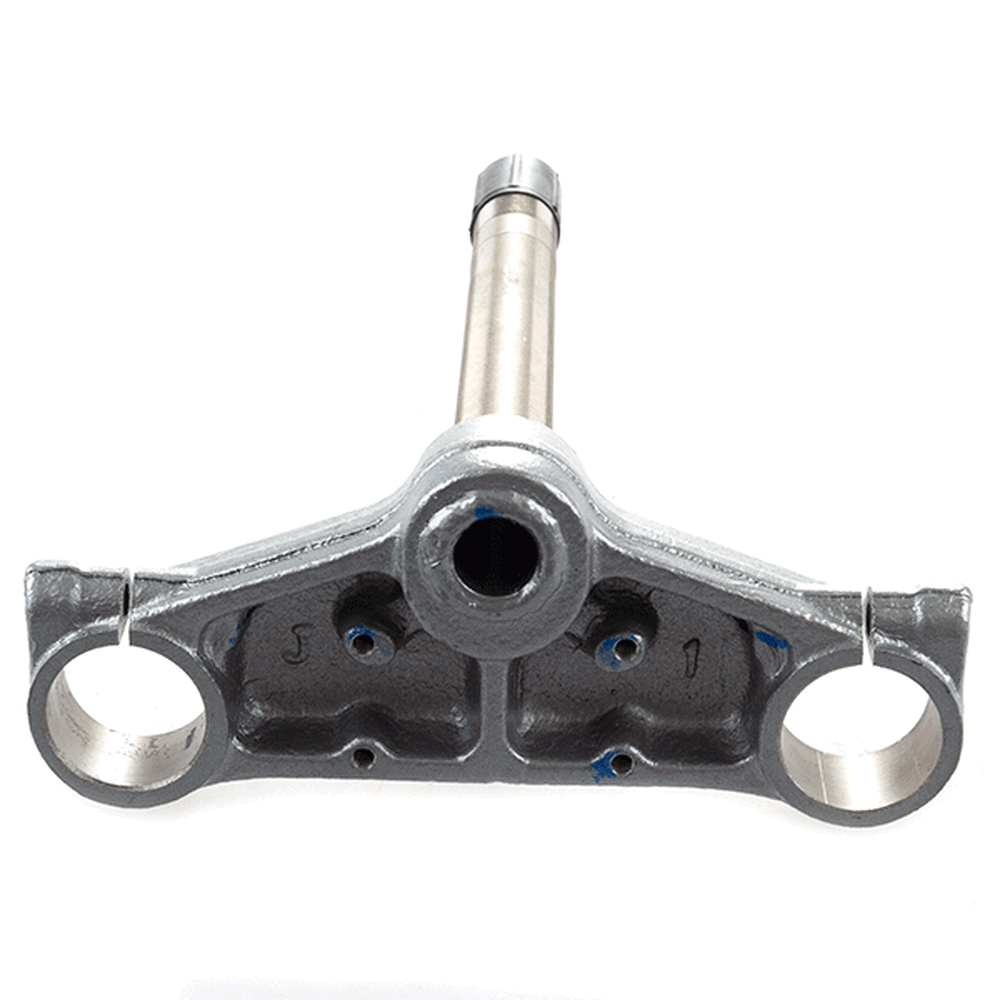 The bottom yoke, also known as the lower triple clamp, is a crucial component in a motorcycle's front suspension system. It connects the two fork tubes and secures them to the steering stem, providing stability and alignment for proper steering and handling. Typically made from durable materials like aluminum or steel, the bottom yoke ensures rigidity and strength while supporting the front end of the motorcycle.