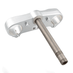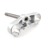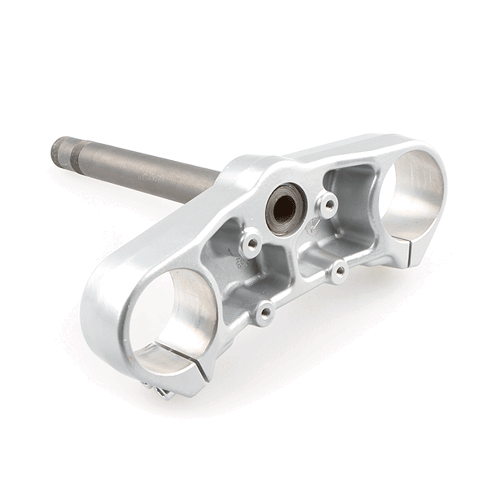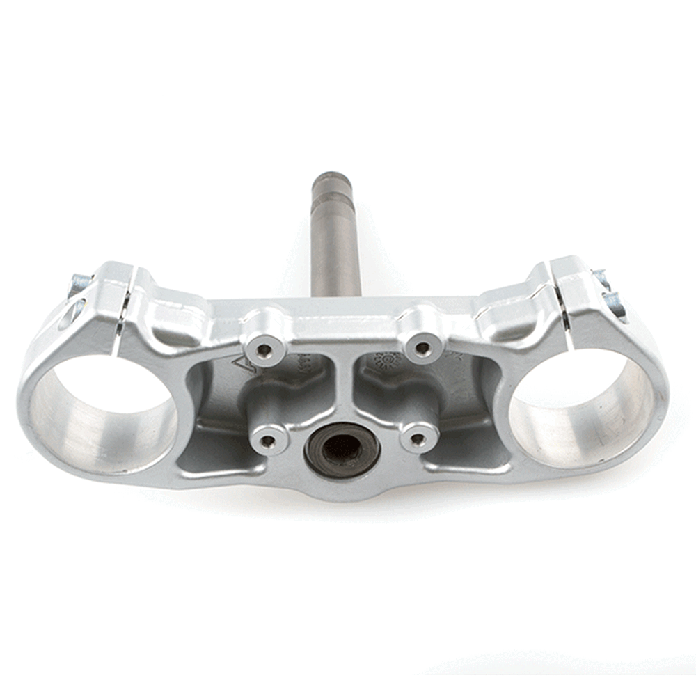 The bottom yoke, also known as the lower triple clamp, is a crucial component in a motorcycle's front suspension system. It connects the two fork tubes and secures them to the steering stem, providing stability and alignment for proper steering and handling. Typically made from durable materials like aluminum or steel, the bottom yoke ensures rigidity and strength while supporting the front end of the motorcycle.