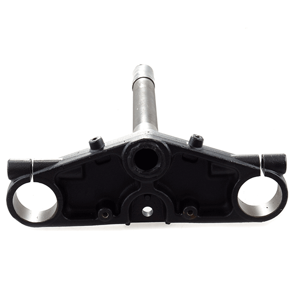 The bottom yoke, also known as the lower triple clamp, is a crucial component in a motorcycle's front suspension system. It connects the two fork tubes and secures them to the steering stem, providing stability and alignment for proper steering and handling. Typically made from durable materials like aluminum or steel, the bottom yoke ensures rigidity and strength while supporting the front end of the motorcycle.