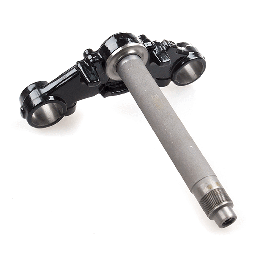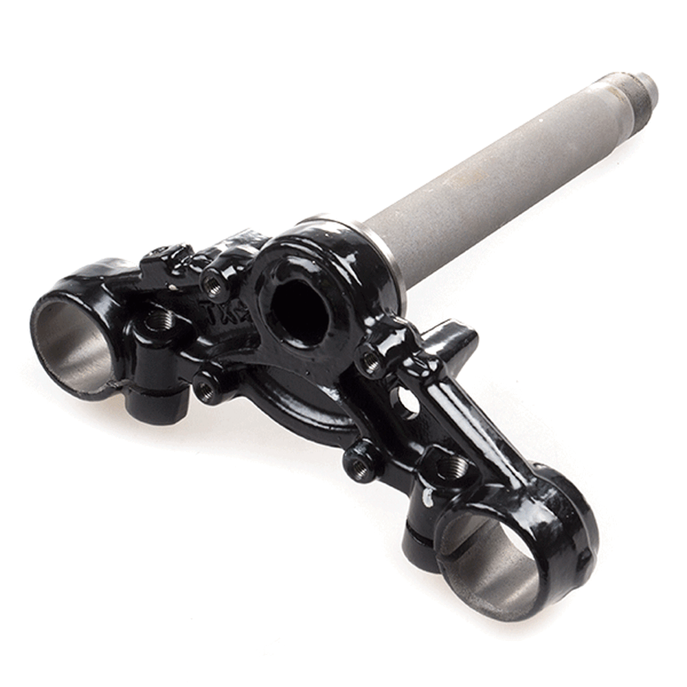 The bottom yoke, also known as the lower triple clamp, is a crucial component in a motorcycle's front suspension system. It connects the two fork tubes and secures them to the steering stem, providing stability and alignment for proper steering and handling. Typically made from durable materials like aluminum or steel, the bottom yoke ensures rigidity and strength while supporting the front end of the motorcycle.