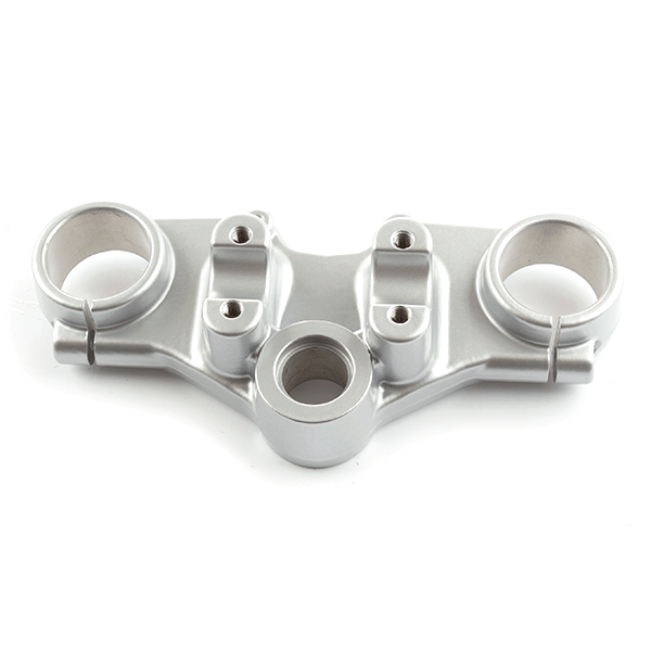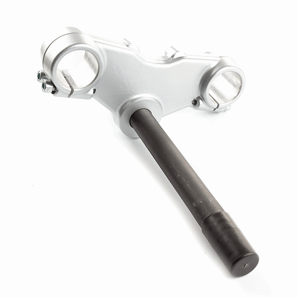 The bottom yoke, also known as the lower triple clamp, is a crucial component in a motorcycle's front suspension system. It connects the two fork tubes and secures them to the steering stem, providing stability and alignment for proper steering and handling. Typically made from durable materials like aluminum or steel, the bottom yoke ensures rigidity and strength while supporting the front end of the motorcycle.