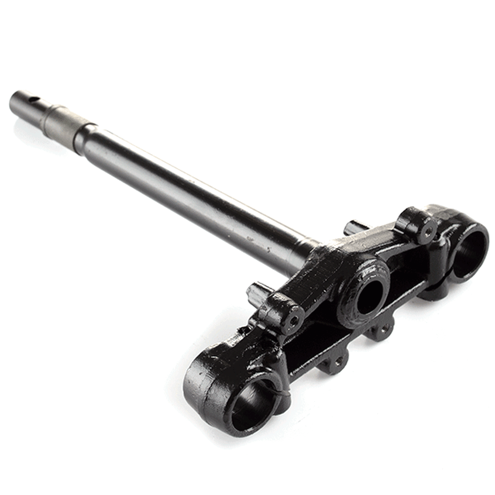 The bottom yoke, also known as the lower triple clamp, is a crucial component in a motorcycle's front suspension system. It connects the two fork tubes and secures them to the steering stem, providing stability and alignment for proper steering and handling. Typically made from durable materials like aluminum or steel, the bottom yoke ensures rigidity and strength while supporting the front end of the motorcycle.