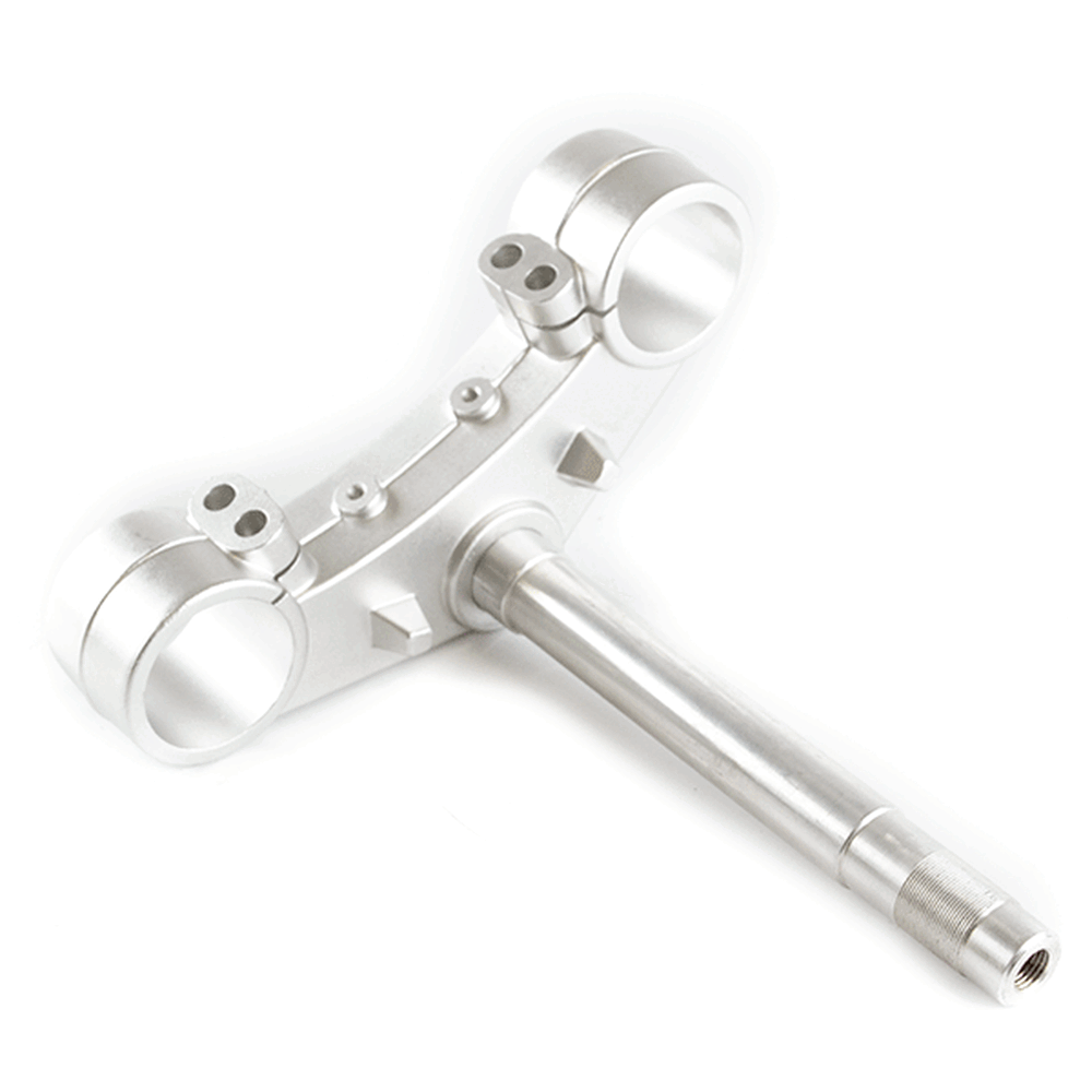 The bottom yoke, also known as the lower triple clamp, is a crucial component in a motorcycle's front suspension system. It connects the two fork tubes and secures them to the steering stem, providing stability and alignment for proper steering and handling. Typically made from durable materials like aluminum or steel, the bottom yoke ensures rigidity and strength while supporting the front end of the motorcycle.