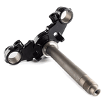 The bottom yoke, also known as the lower triple clamp, is a crucial component in a motorcycle's front suspension system. It connects the two fork tubes and secures them to the steering stem, providing stability and alignment for proper steering and handling. Typically made from durable materials like aluminum or steel, the bottom yoke ensures rigidity and strength while supporting the front end of the motorcycle.