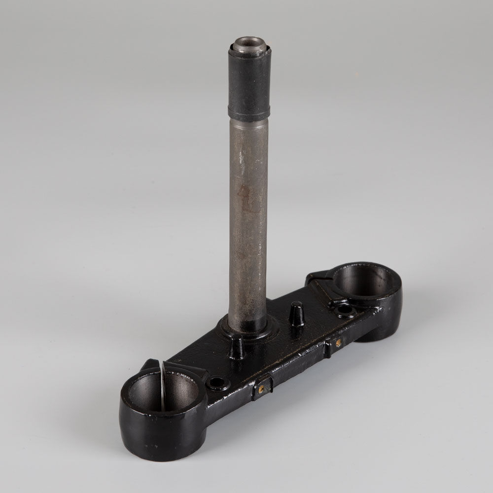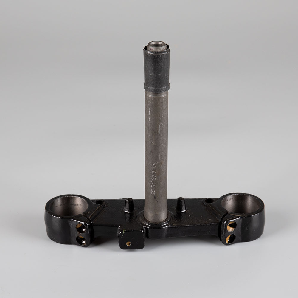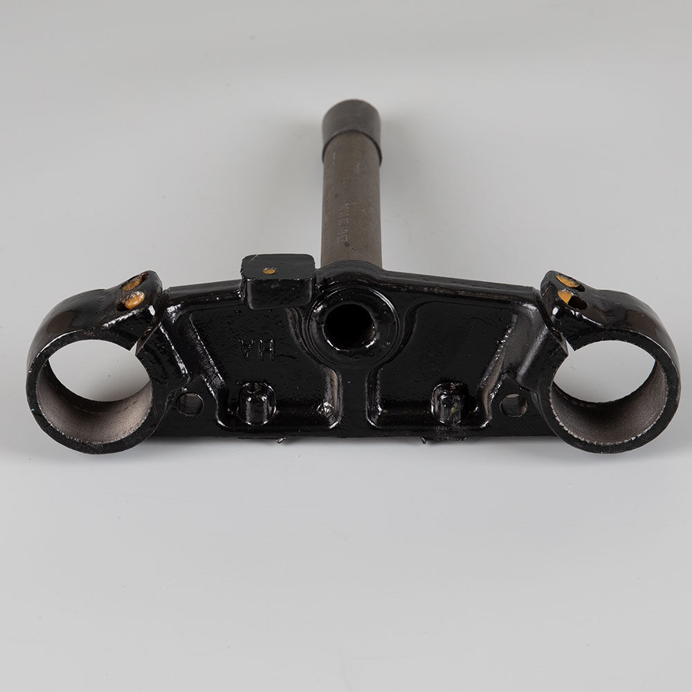 The bottom yoke, also known as the lower triple clamp, is a crucial component in a motorcycle's front suspension system. It connects the two fork tubes and secures them to the steering stem, providing stability and alignment for proper steering and handling. Typically made from durable materials like aluminum or steel, the bottom yoke ensures rigidity and strength while supporting the front end of the motorcycle.