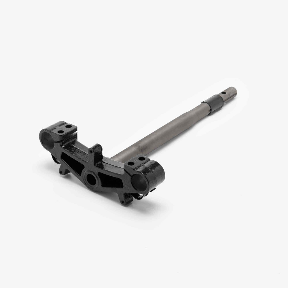 The bottom yoke, also known as the lower triple clamp, is a crucial component in a motorcycle's front suspension system. It connects the two fork tubes and secures them to the steering stem, providing stability and alignment for proper steering and handling. Typically made from durable materials like aluminum or steel, the bottom yoke ensures rigidity and strength while supporting the front end of the motorcycle.