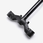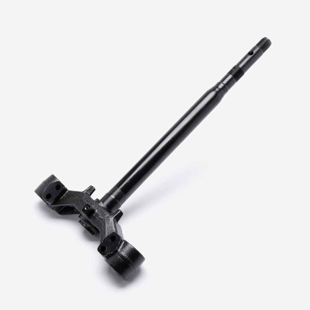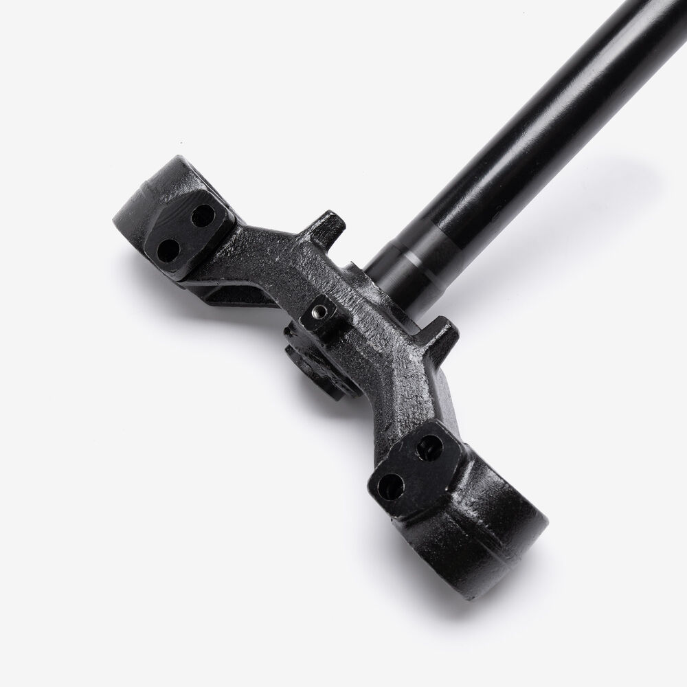 The bottom yoke, also known as the lower triple clamp, is a crucial component in a motorcycle's front suspension system. It connects the two fork tubes and secures them to the steering stem, providing stability and alignment for proper steering and handling. Typically made from durable materials like aluminum or steel, the bottom yoke ensures rigidity and strength while supporting the front end of the motorcycle.