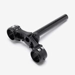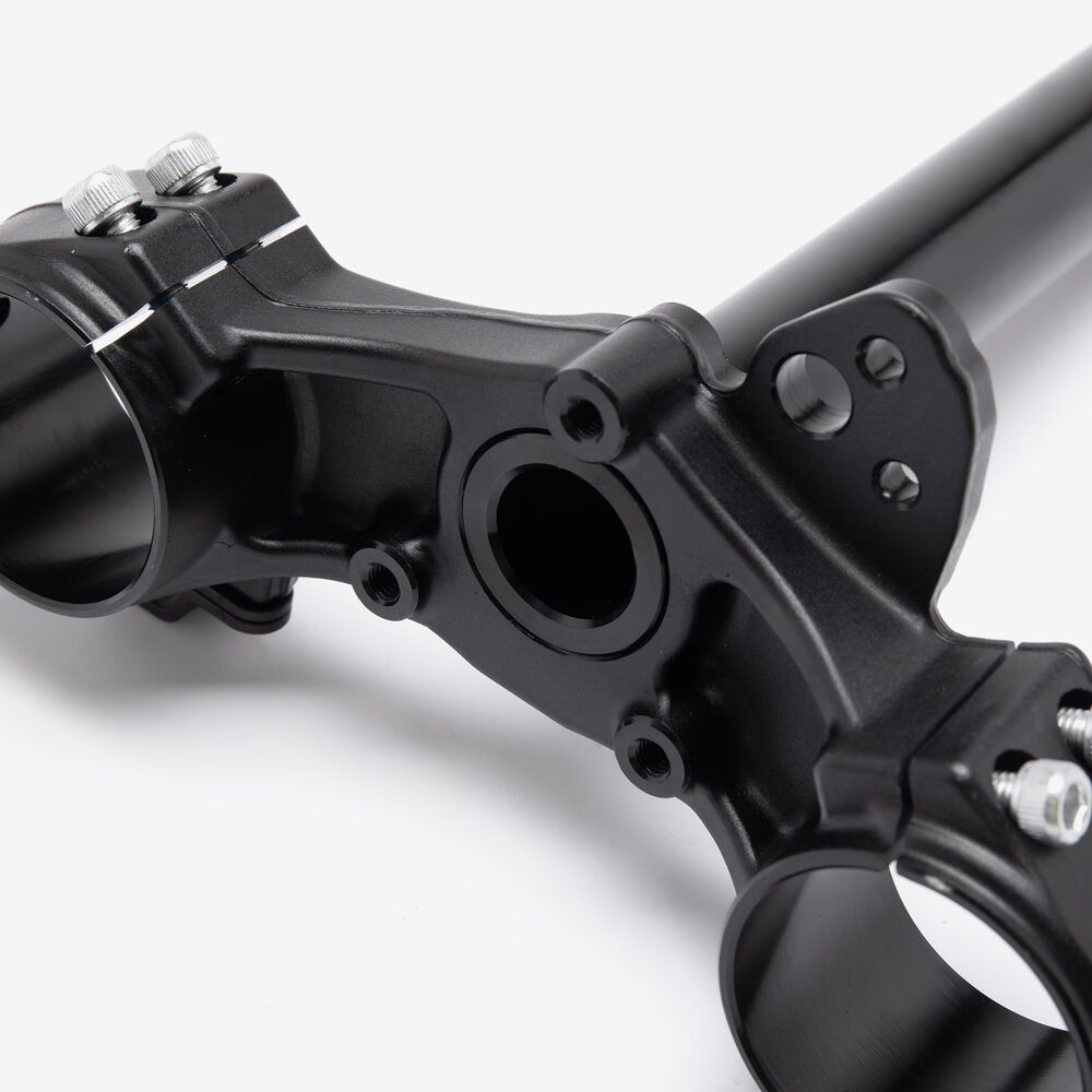 The bottom yoke, also known as the lower triple clamp, is a crucial component in a motorcycle's front suspension system. It connects the two fork tubes and secures them to the steering stem, providing stability and alignment for proper steering and handling. Typically made from durable materials like aluminum or steel, the bottom yoke ensures rigidity and strength while supporting the front end of the motorcycle.