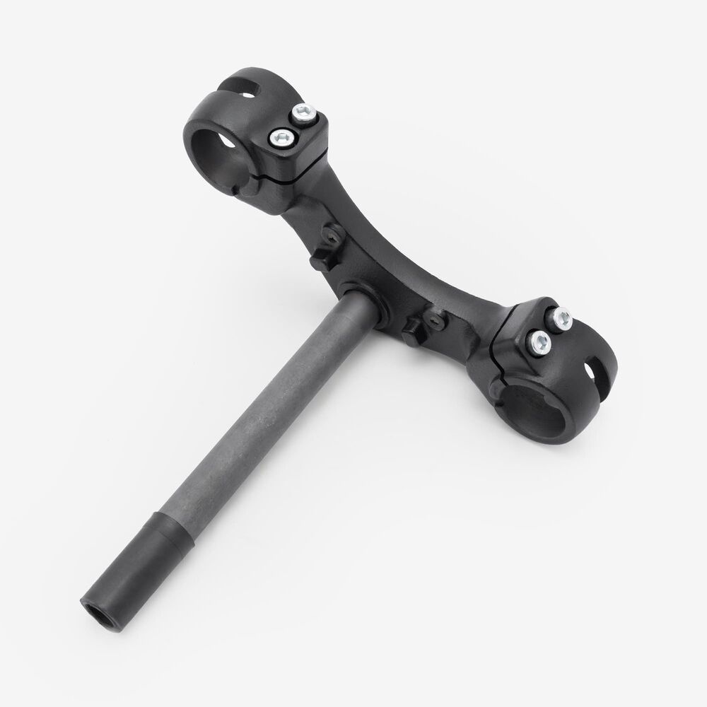 The bottom yoke, also known as the lower triple clamp, is a crucial component in a motorcycle's front suspension system. It connects the two fork tubes and secures them to the steering stem, providing stability and alignment for proper steering and handling. Typically made from durable materials like aluminum or steel, the bottom yoke ensures rigidity and strength while supporting the front end of the motorcycle.