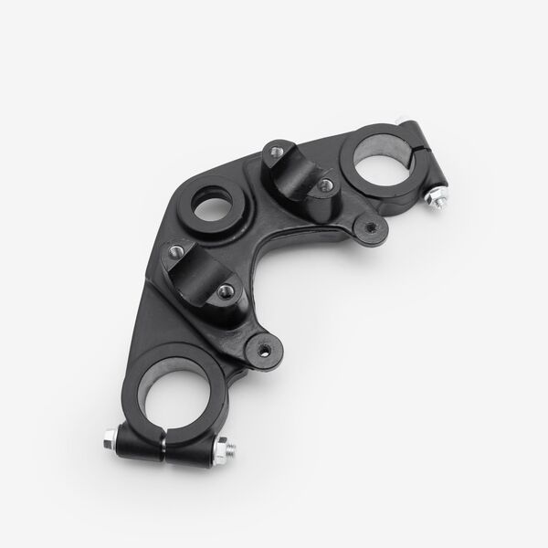 The bottom yoke, also known as the lower triple clamp, is a crucial component in a motorcycle's front suspension system. It connects the two fork tubes and secures them to the steering stem, providing stability and alignment for proper steering and handling. Typically made from durable materials like aluminum or steel, the bottom yoke ensures rigidity and strength while supporting the front end of the motorcycle.