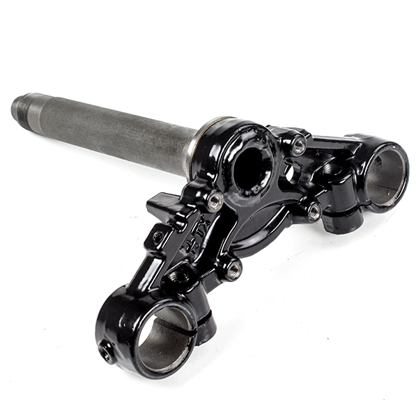 A motorcycle fork connects a motorcycle's front wheel and axle to its frame, typically via a yoke, also known as a triple clamp, which consists of an upper yoke joined to a lower yoke via a steering stem, a shaft that runs through the steering head, creating the steering axis.